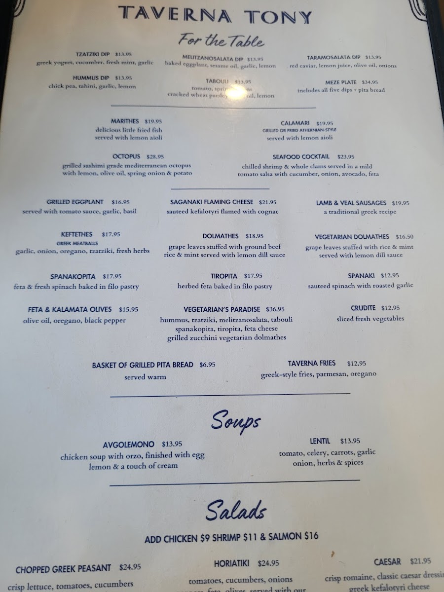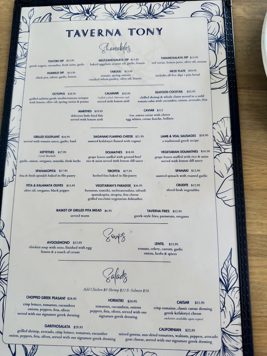 The Taverna Tony Menu brings a delightful taste of Mediterranean flavors to Malibu. Located at 23410 Civic Center Way, this spot offers a cozy atmosphere with a menu that features a range of fresh, vibrant dishes. Whether you're craving a classic Greek gyro, tender lamb chops, or a refreshing salad with homemade dressing, there's something for everyone. The seafood options are particularly popular, with dishes that celebrate the bounty of the ocean, perfectly seasoned and cooked to perfection. Don’t miss out on the mezze platters, ideal for sharing, or indulge in a warm, comforting spanakopita. If you're looking to unwind with a drink, the wine list pairs beautifully with the food, enhancing every bite. No matter what you choose, dining here is an experience that feels like a special getaway right in the heart of Malibu.
